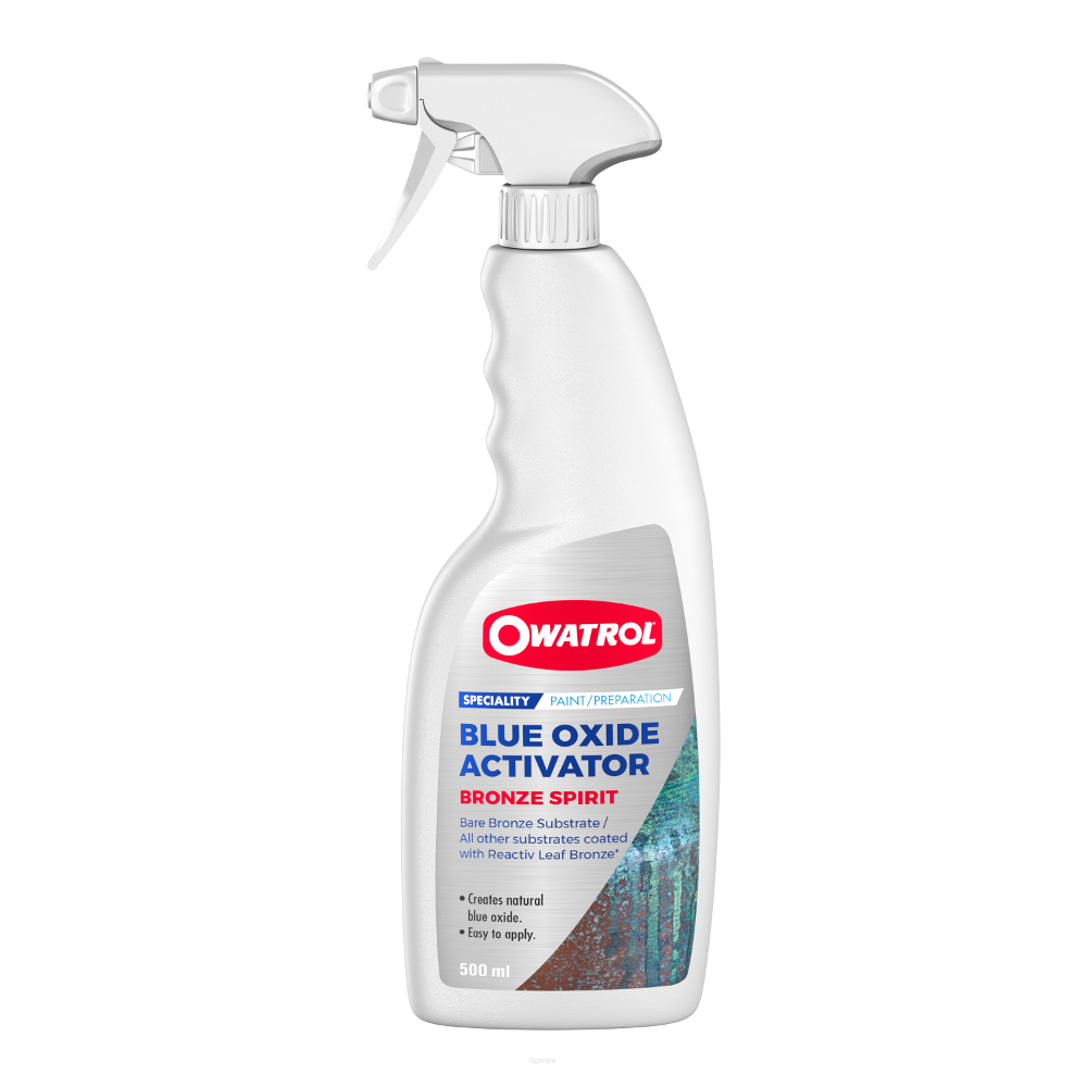 Bronze Spirit to aktywator z niebieskim tlenkiem do tworzenia realistycznych efektów dekoracyjnych na gołych powierzchniach z brązu lub powierzchniach zabezpieczonych farbą z brązem z serii Owatrol Spirit Reactiv Leaf Bronze.